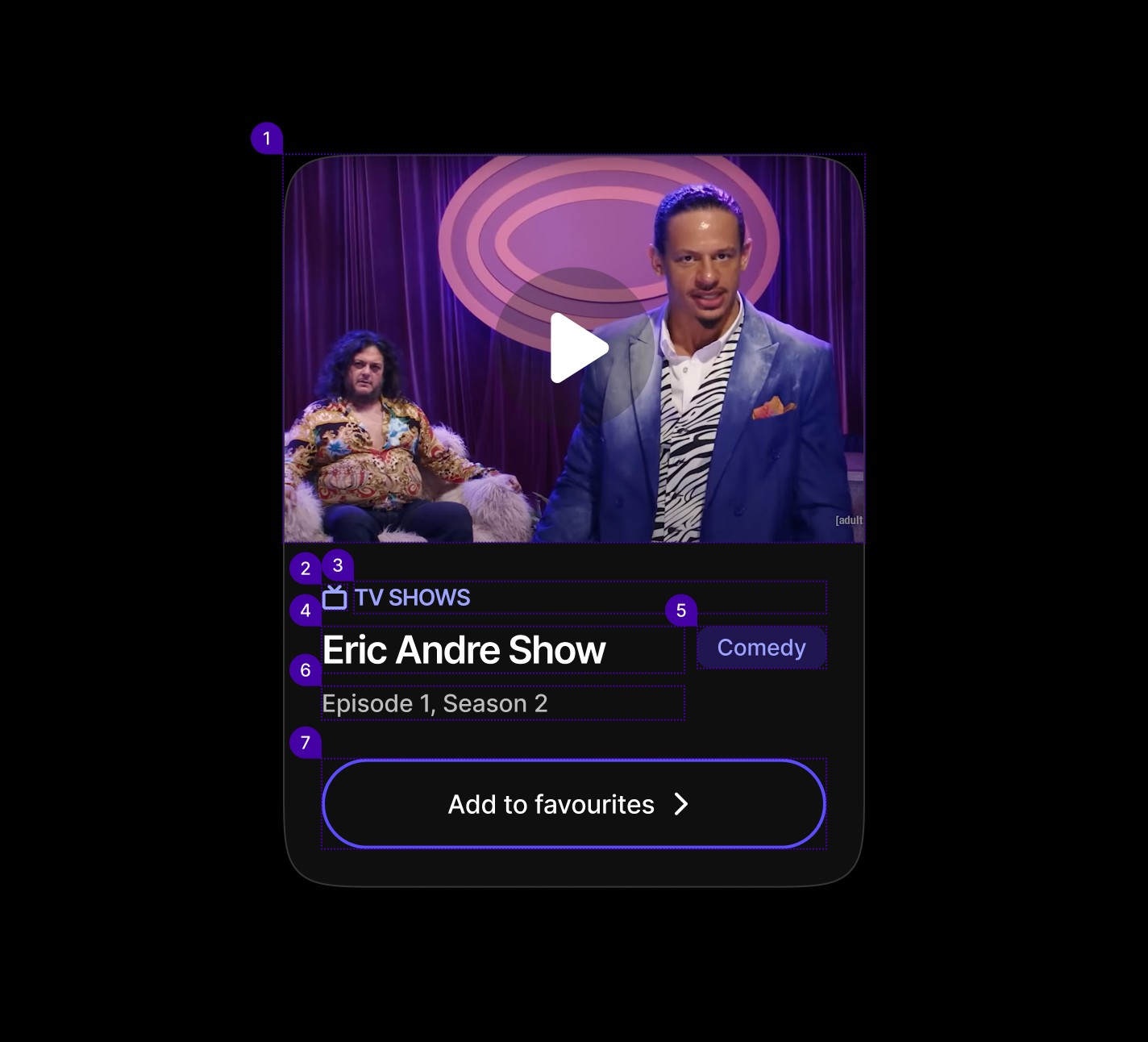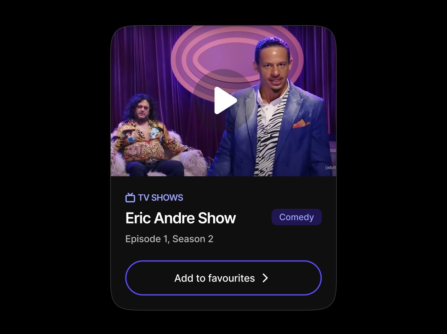 Media-focused cards showcasing TV shows, movies, or content with category overlines, badges for genres or status, and action buttons for favoriting or interaction. These cards emphasize visual hierarchy and content discovery.