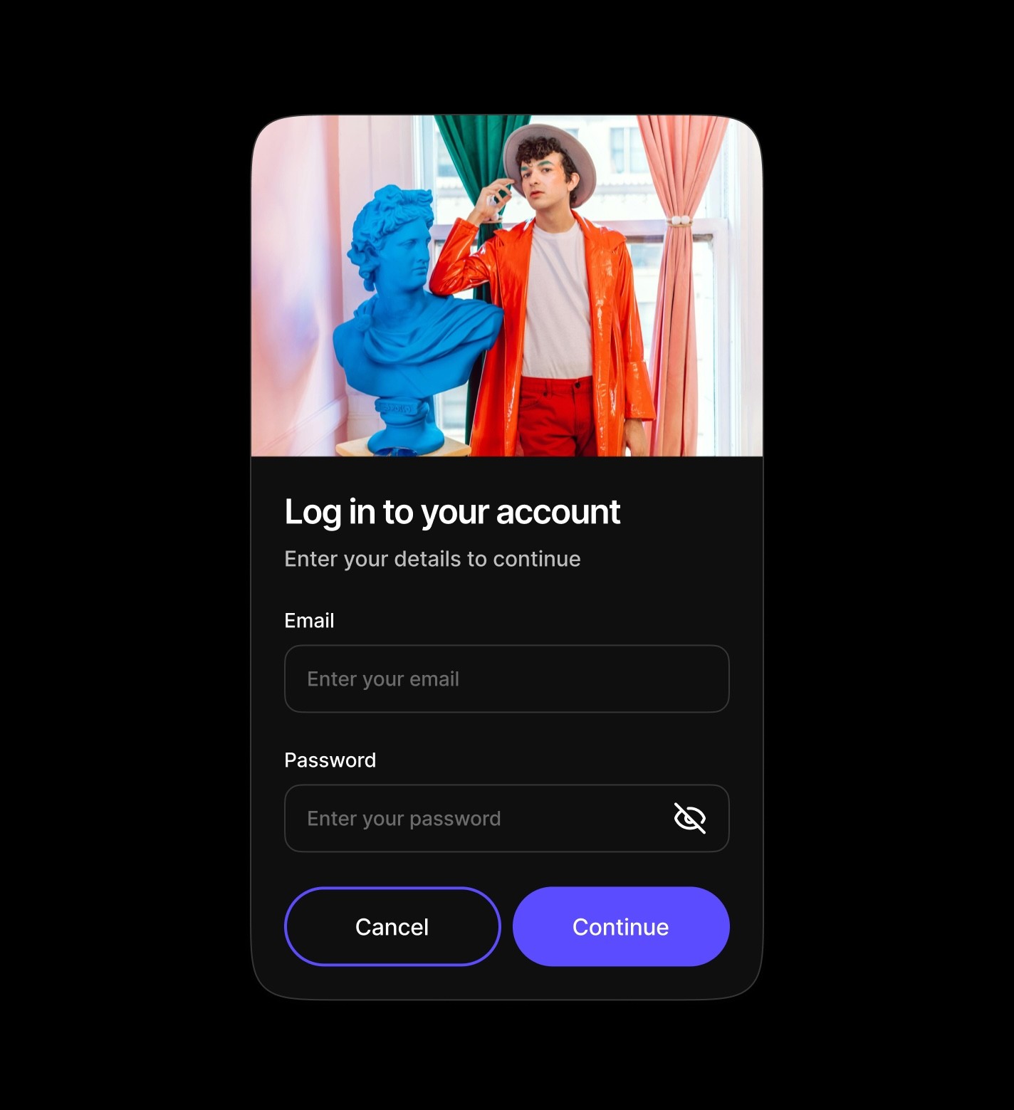 Traditional input forms featuring header imagery, titles, and multiple form fields like email and password inputs. These cards are ideal for login, signup, and data collection workflows with clear call-to-action buttons for form submission or cancellation.