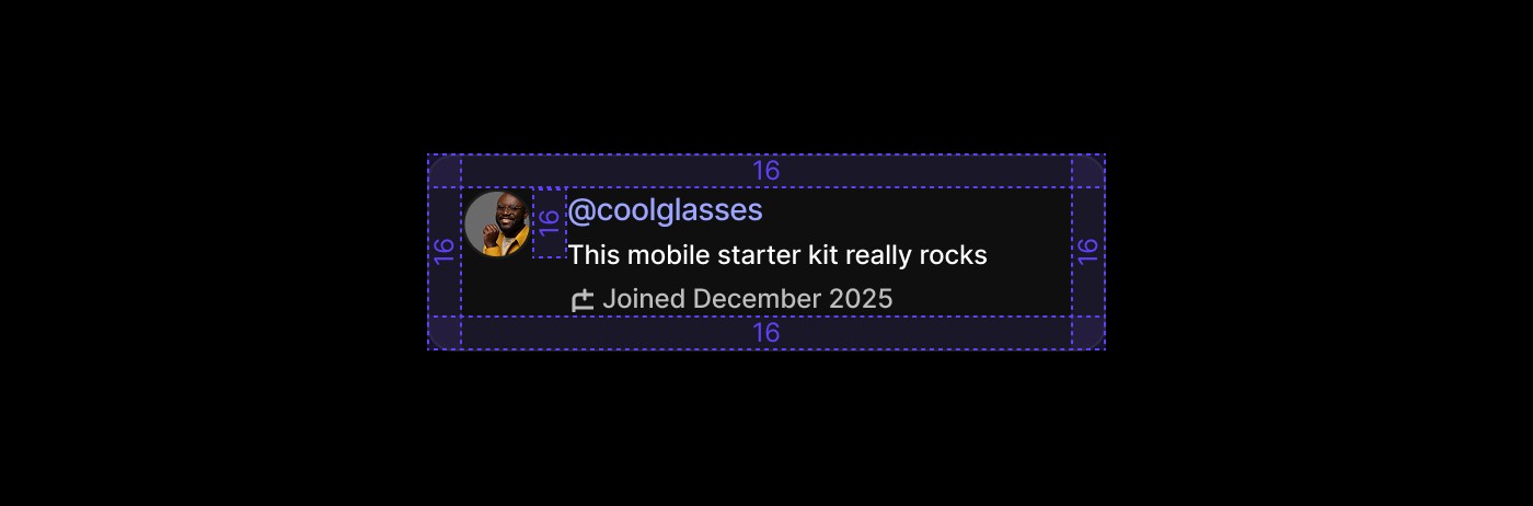 Consistent 16px padding keeps the layout clear and balanced. Even spacing between the avatar, labels, and shortcuts ensures readability, accessibility, and a compact visual structure.
