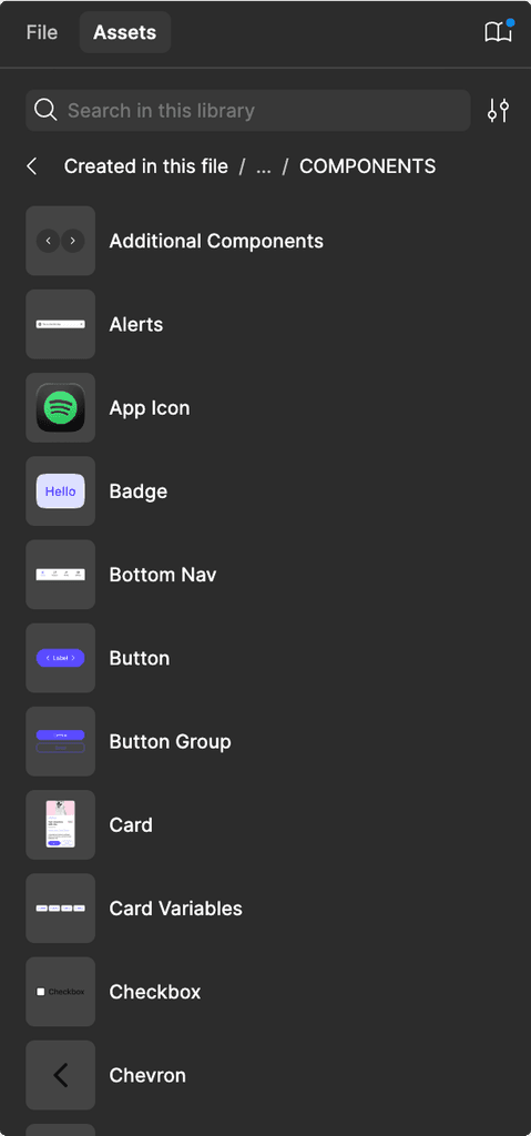 Each component is listed in the assets panel for easy access. We keep components visible and avoid nesting them in too many subfolders. For complex components, their building blocks are located in the respective sub-components folder.