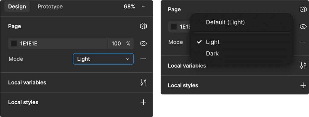 You can toggle between light and dark modes by selecting the ‘Mode’ dropdown in the Figma ‘Design’ panel to the right. To apply, select Light or Dark from the Mode dropdown selector.